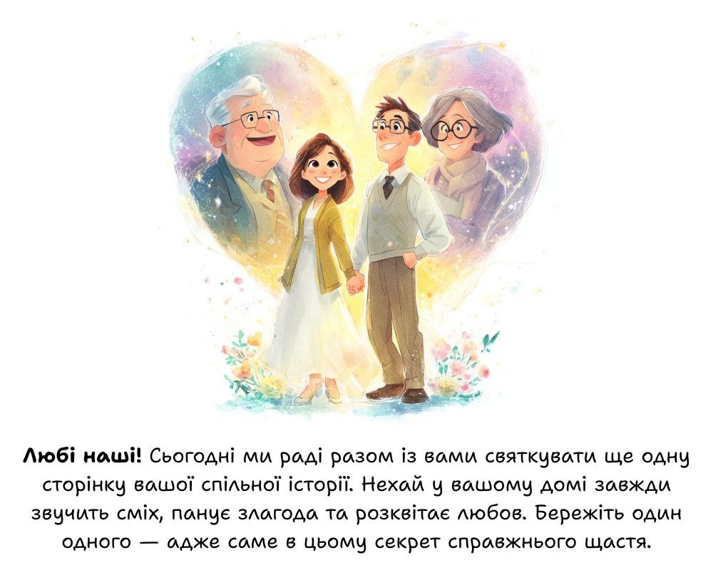 Для батьків річниця весілля дітей – це не просто чергова дата. Це ще один рік, у якому їхні “діти” стали трішки дорослішими, мудрішими, міцнішими у своєму “ми”. Вони пам’ятають день, коли проводжали вас у спільну дорогу – з хвилюванням і надією. І щороку, бачачи, як Ви тримаєтеся одне за одного, радіють, ніби вперше.
